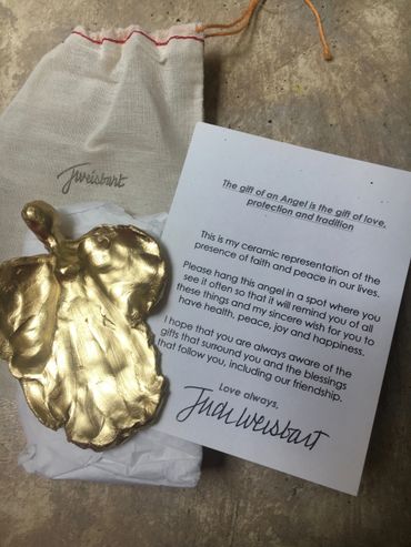 Angels offered in three colors (gold painted bisque, white high fired glazed, or blue/green glazed). Hearts offered in 4 patterns (plain, bee, hearts, designs).